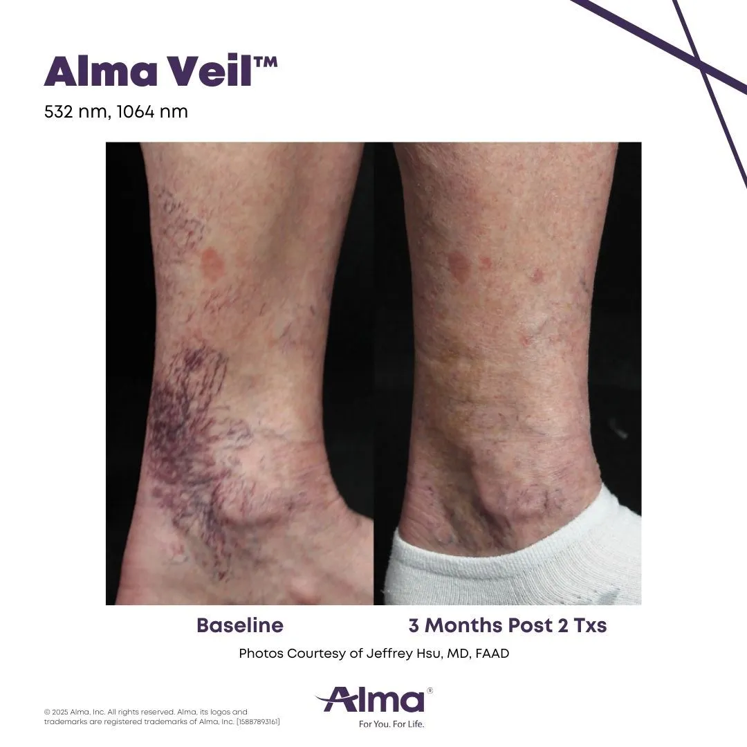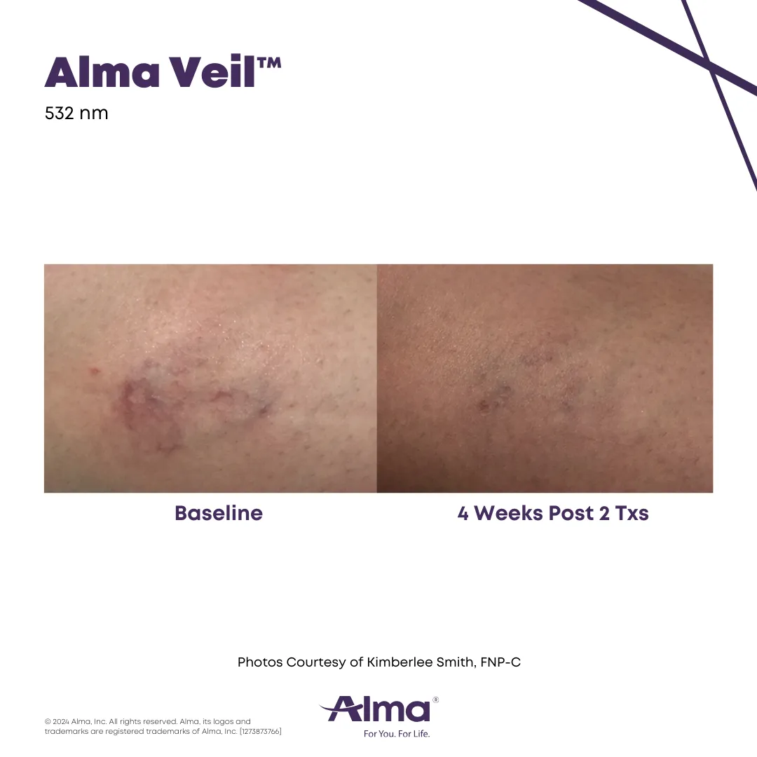 Alma Veil has specialized settings for treating small vascular concerns. The laser energy can safely target superficial blood vessels, helping to reduce the appearance of redness, broken capillaries, telangiectasias, and visible veins on the face and body. This treatment if done on the body is best paired with compression and it is vital to minimize raising body temperature up to 2 weeks pre and post treatment